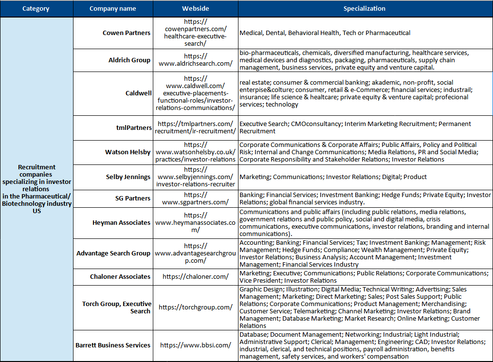Recruitment companies investor relations in the Pharma-Biotechnology in the United States